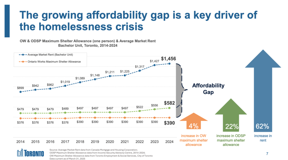 The key driver of homelessness in Toronto is the economy and the housing market. Rental costs have increased dramatically over the past 15 years and a lack of affordable housing has increased to record high numbers. Majority of shelter users receive Ontario Works or Ontario Disability Support, however, social assistance rates don’t respond to local economic factors that contribute to the growing affordability gap. Affordability is the most significant challenge in helping move people out of shelters.